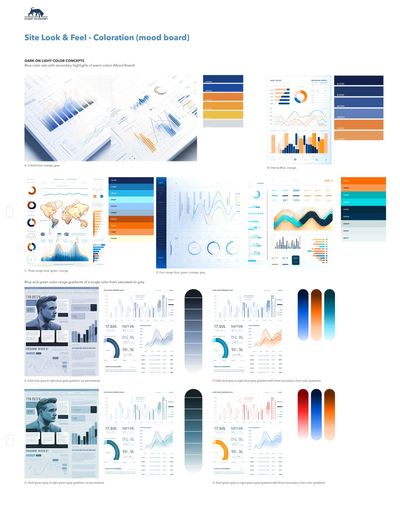 The project only had a single established base color, a darker blue shade used in the existing logo. Based on this, we explored a primary color approach by using shades drawn from this blue and bright contrasting colors like oranges and reds to create a visual dynamic. We conducted thorough research on various strategies in this direction, looking at competitive products in the charting vertical. To expand our ideas, we enlisted the services of Mid-Journey to explore additional possibilities.