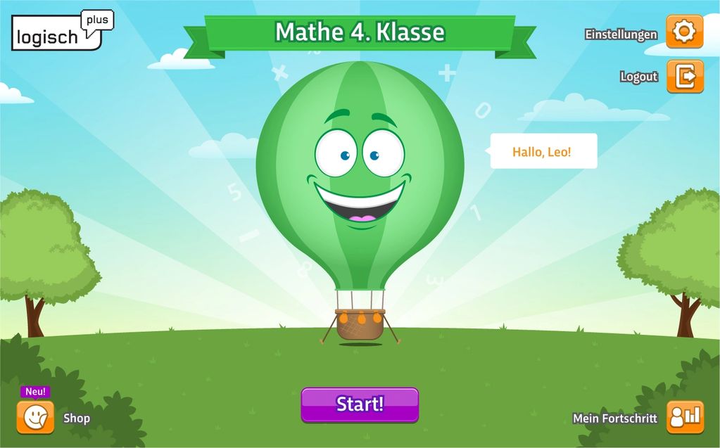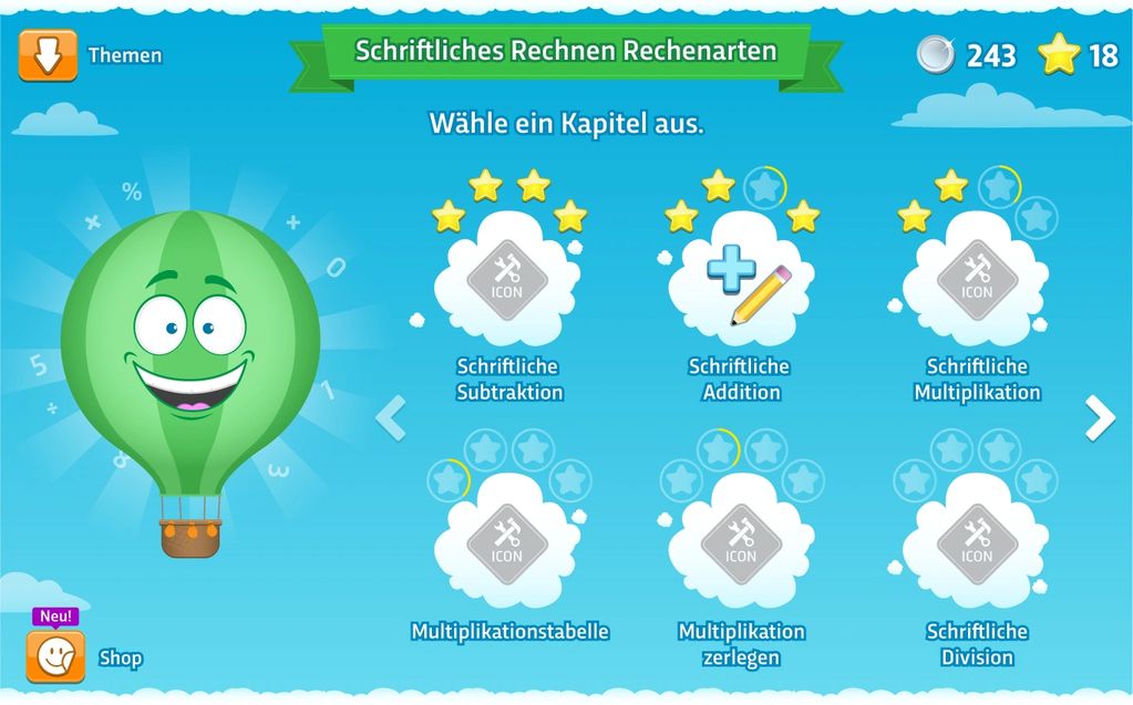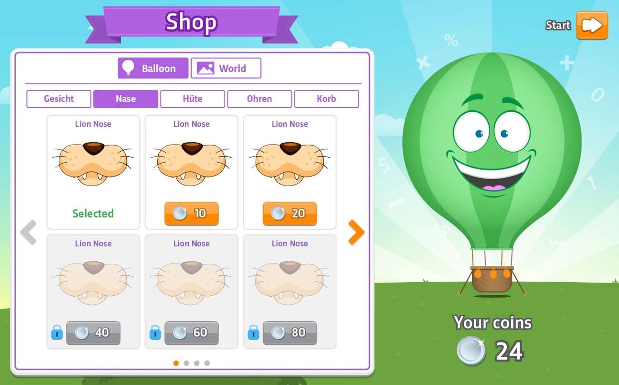 Math4 start screen. As the student earns coins from completing exercises, they can change the balloon's face, coloration, and background.