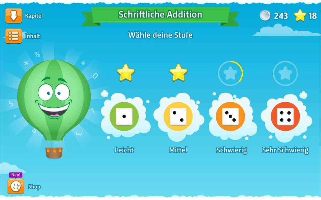 To create an experience for the students that were engaging and motivational in learning the math lessons presented, we drew from traditional gamification approaches to design a character personalization system. Using a customizable balloon, the student could personalize the character with decorations and fun animations purchased from the app’s online shop. We designed an in-game coin economy around earning coins as they completed lessons. Their personalized balloon companion always accompanied the student on their lesson journeys with instructions and help when needed.
