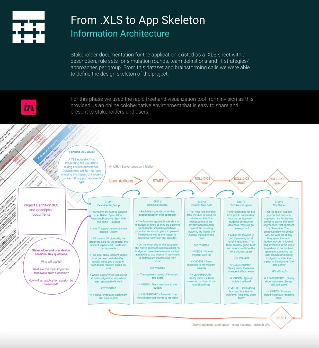 With the idea, the team at IBM created an Excel sheet outlining the steps of the simulation using a series of events that demonstrated the impact of incidents on a data center. We then created a step-by-step flow of how the simulation would unfold using dice, a gamified leaderboard, and animated videos to bring community and fun to the idea.